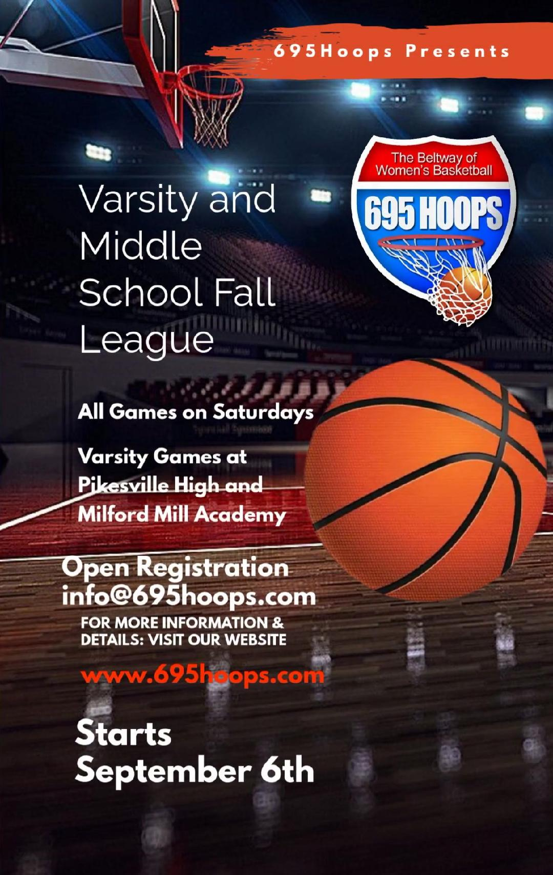 695Hoops sponsors an annual varsity fall league at Pikesville High School in Baltimore County. The league runs 7 or 8 weeks and attracts teams from all over Maryland. Media coverage of the league is handled by Prep Girls Hoops, 695Hoops and DYE Sporting Network. The games are regularly attended by division II, division III and junior college coaches. We offer flexible scheduling and try to accommodate all requests, but sometimes it is not possible.